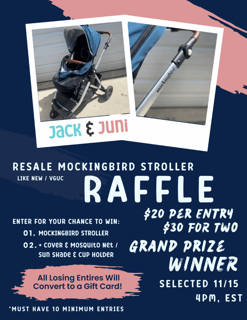 Grand Prize: One (1) Resale Mockingbird Stroller in “Like New” / VGUC condition, plus a cover, mosquito net, sun shade, and cup holder. This is a RESALE product and is not NEW! This item must be PICKED UP at our warehouse located at 7620 Investment Court Owings, MD 20736.